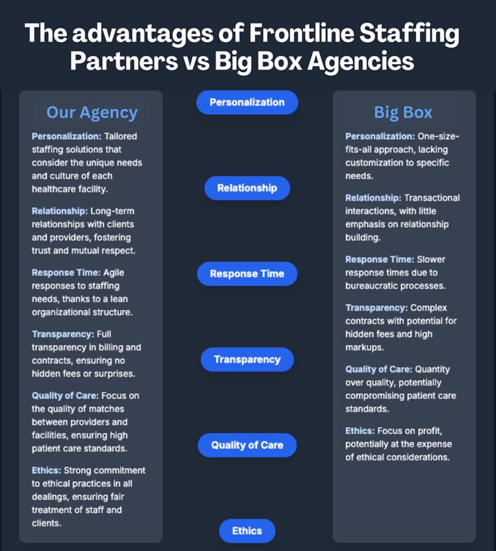Frontline Staffing Partners stands apart from larger agencies by offering a truly personalized, relationship-driven approach. We understand that every healthcare facility is unique, which is why we provide tailored staffing solutions that align with your specific needs and culture.